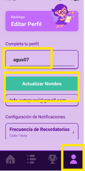 • Dirígete al cuarto ícono de la barra inferior, correspondiente al perfil. Allí podrás editar tu nombre para proteger tus datos personales.